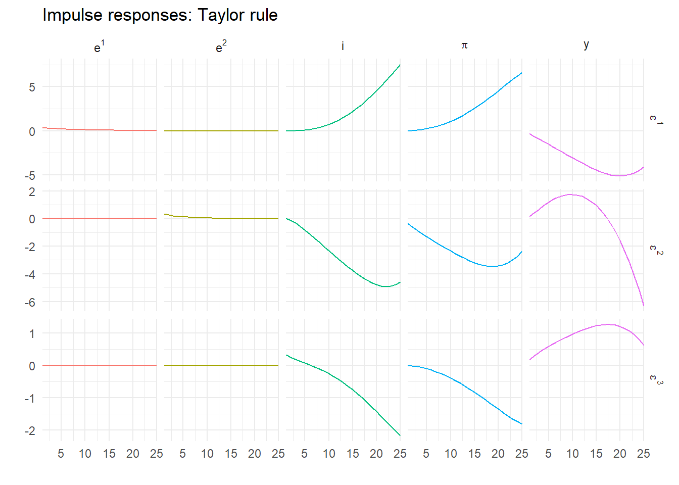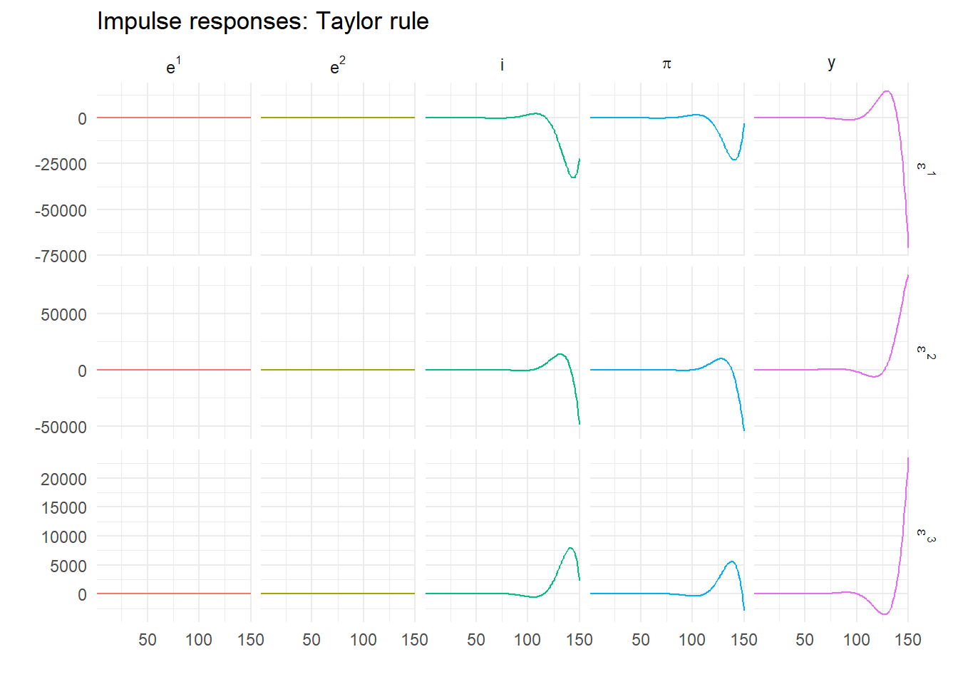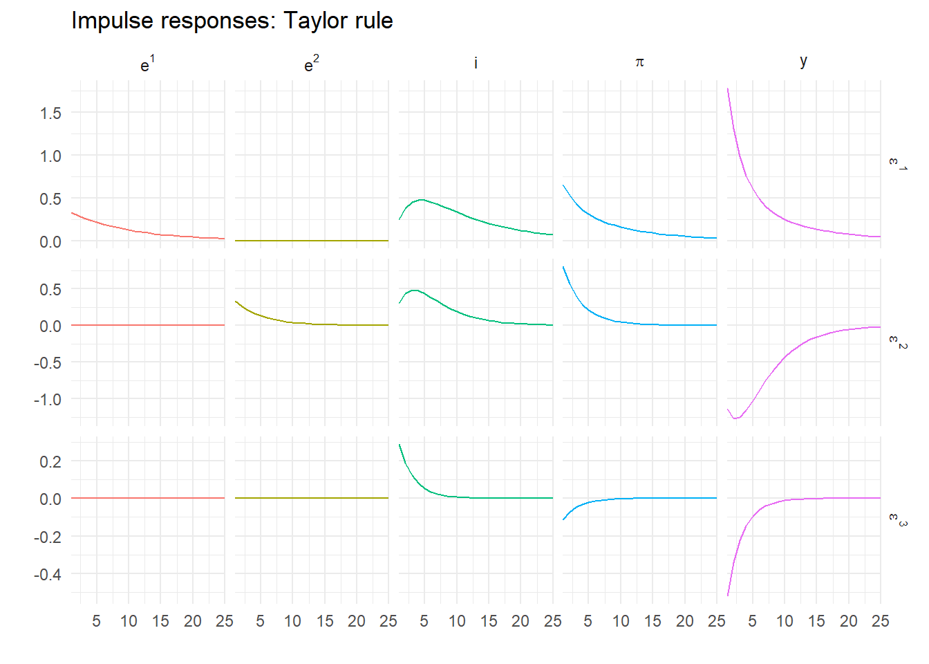 But even this doesn’t exhaust the possible re-parametrisations of the model. We can reduce the number of jump variables to 1 and find the same solution. There exist formal methods for reducing models (see King and Watson (2002)) but there is an obvious way to proceed here. From the targeting rule, it must be that \[ y^e_{t+1} = y_t - \frac{1}{\mu}\pi^e_{t+1} \] as the expected shock is zero. This means the IS curve can be rewritten \[ y_t = y_t - \frac{1}{\mu}\pi^e_{t+1} - \frac{1}{\sigma} \left (i_t - \pi_{t+1}^e \right ) + e_t^1 \] implying \[ i_t = \left (1 - \frac{\sigma}{\mu} \right )\pi_{t+1}^e + \sigma e_t^1 \] This is the required interest rate consistent with the targeting rule holding. Now the only jump variable is the inflation rate as we have eliminated the expected output gap. \[\begin{align} y_t &= y_{t-1} -\frac{1}{\mu} \pi_t + \frac{1}{\mu} \varepsilon^3_t \\ \pi_t &= \beta \pi_{t+1}^e + \kappa y_t + e_t^2 \\ i_t &= \left (1 - \frac{\sigma}{\mu} \right ) \pi_{t+1}^e + \sigma e_t^1 \\ e_t^1 &= \rho_1 e_{t-1}^1 + \varepsilon_t^1 \\ e_t^2 &= \rho_2 e_{t-1}^2 + \varepsilon_t^2 \end{align}\]
