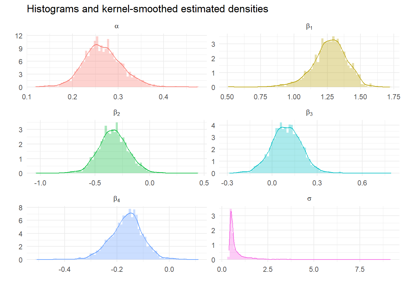 For example, the estimated mean of the marginal distribution of \(\phi_i\) is \[ \bar \phi_i = \frac{\sum_{j=p+1}^n \phi_i^j}{n-p} \] where we discard the first \(p\) draws.