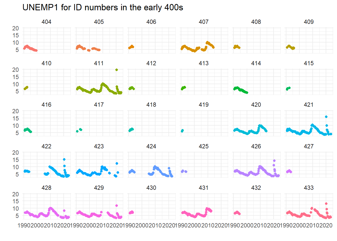 labs(x="", y="", title="UNEMP1 for ID numbers in the early 400s")