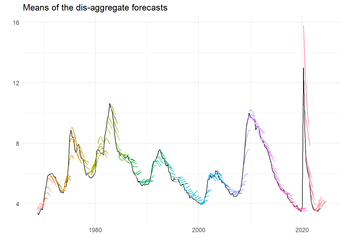 labs(title="Means of the dis-aggregate forecasts", x="", y="")