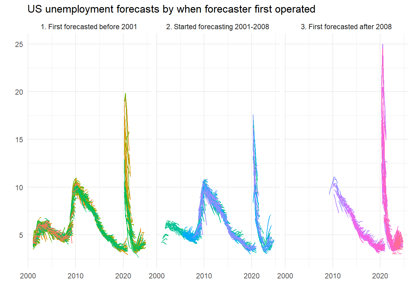 labs(title="US unemployment forecasts by when forecaster first operated", x="", y="")