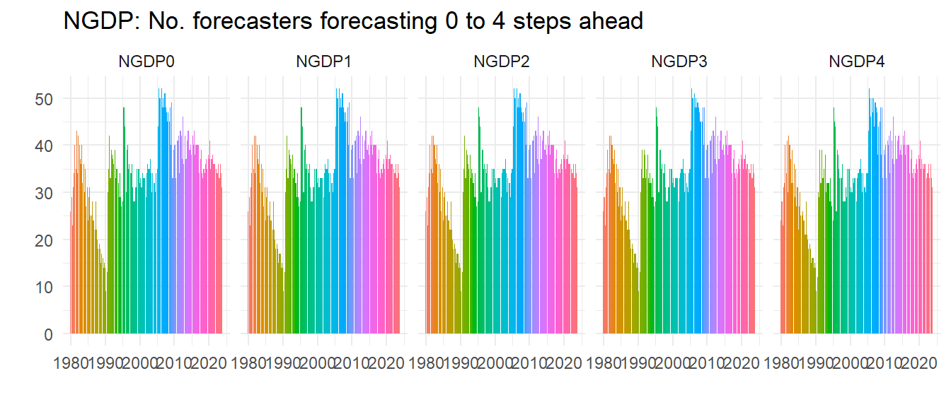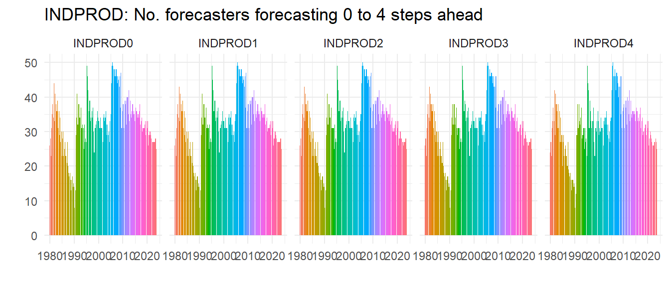 labs(title="UNEMP: No. forecasters forecasting 0 to 4 steps ahead", x="", y="") +
