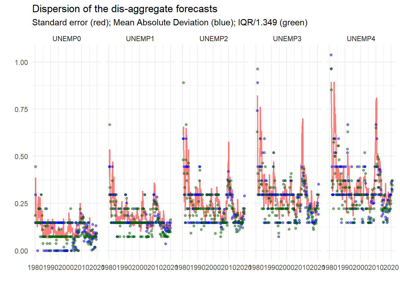 So already, this looks useful. We can see that the dispersion measures – standard deviation, mean absolute deviation and inter-quartile range4 – conform to type, getting larger the longer the horizon, bigger at turning points etc.
