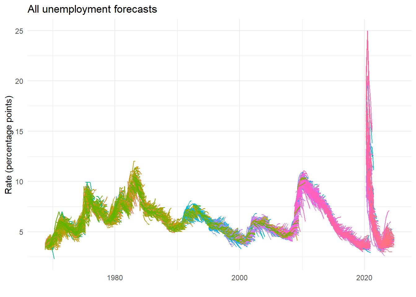 labs(title="All unemployment forecasts", x="", y="Rate (percentage points)")